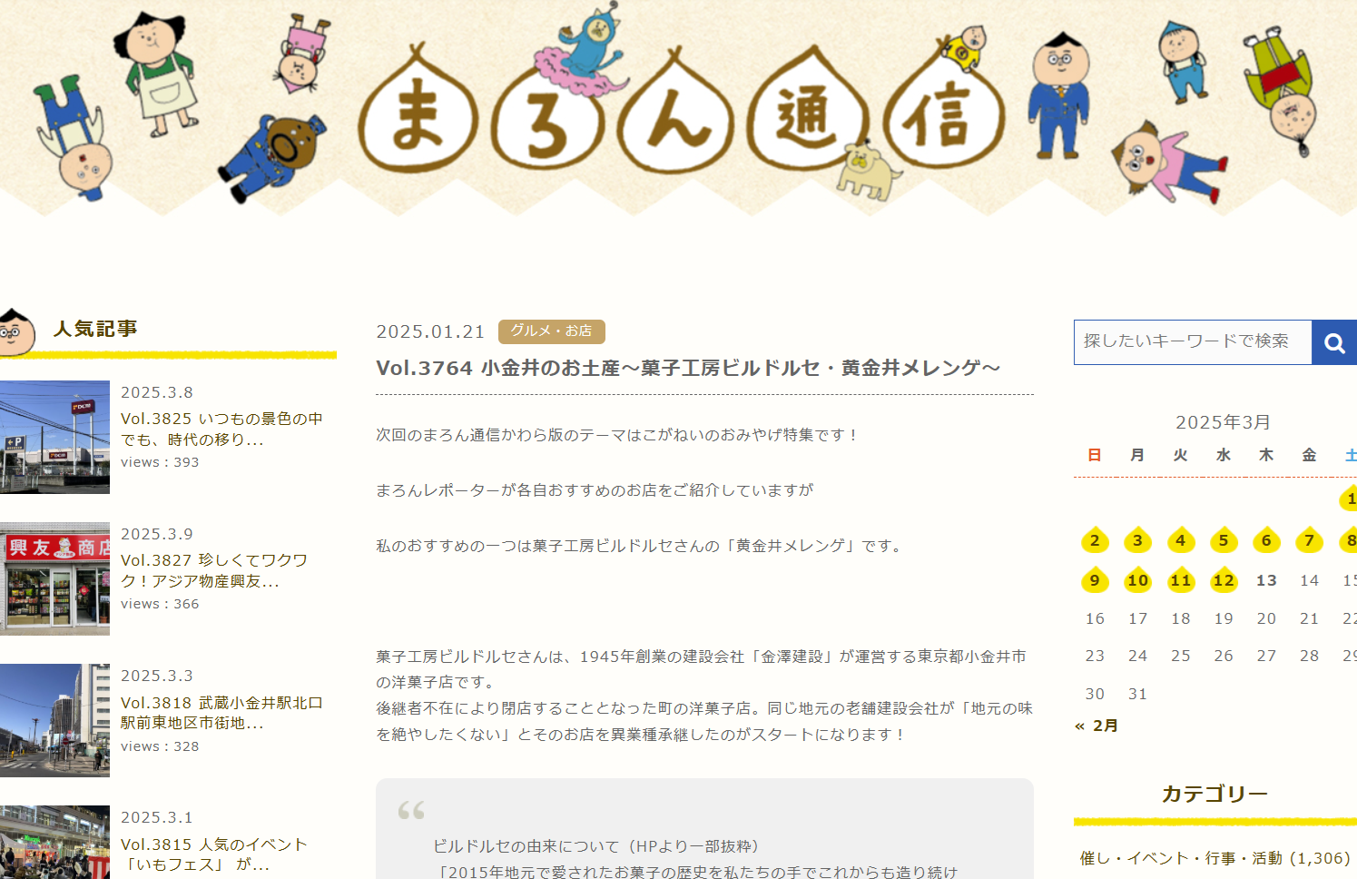 2025.01.21 まろん通信ブログ vol.3764 掲載緑豊かなまろんの里で暮らしている栗の住人『まろんの里のなかまたち』が小金井市の魅力やおすすめ情報をお届けしているブログ版まろん通信にて、市民レポーターのルンルン親子さんが当店を記事にしていただきました。タイトルは「Vol.3764 小金井のお土産~菓子工房ビルドルセ・黄金井メレンゲ~」です。感謝でございます。 |